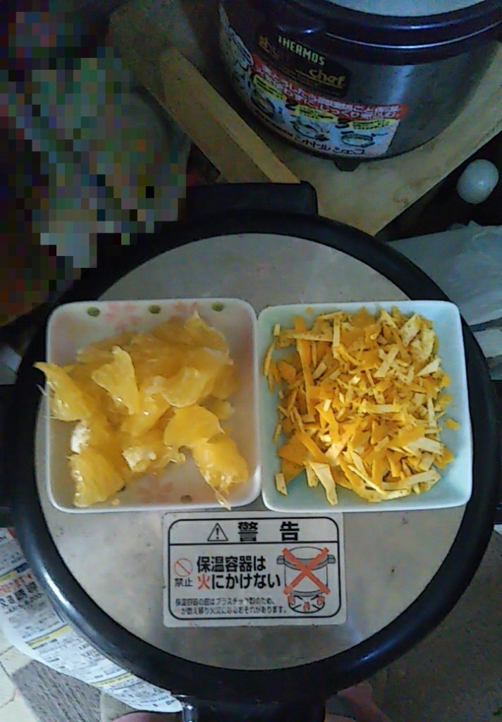 皮と身の下にあるのは、私が愛用している保温調理器「ShuttleChef」(手前が大、奥が小)。