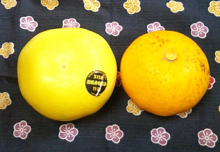 家族がメロゴールド(Melogold)というグレープフルーツを買ってきたのと(左)、会社の敷地でなっていたという無農薬夏みかんを貰ってきたので、色々使う事にしました。