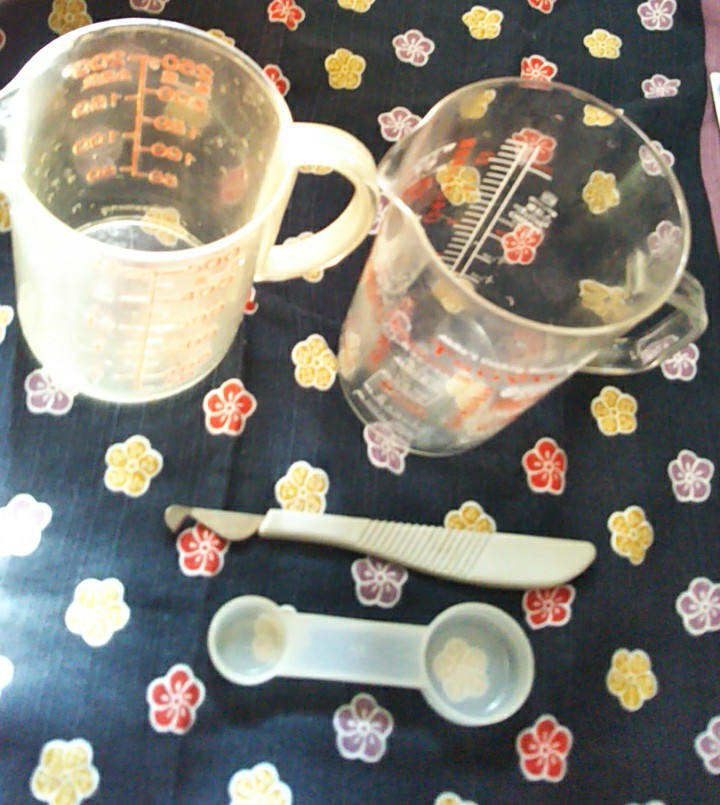 カップ右は、液体の量は勿論のこと、小麦粉・砂糖のgram数が分かる目盛付。