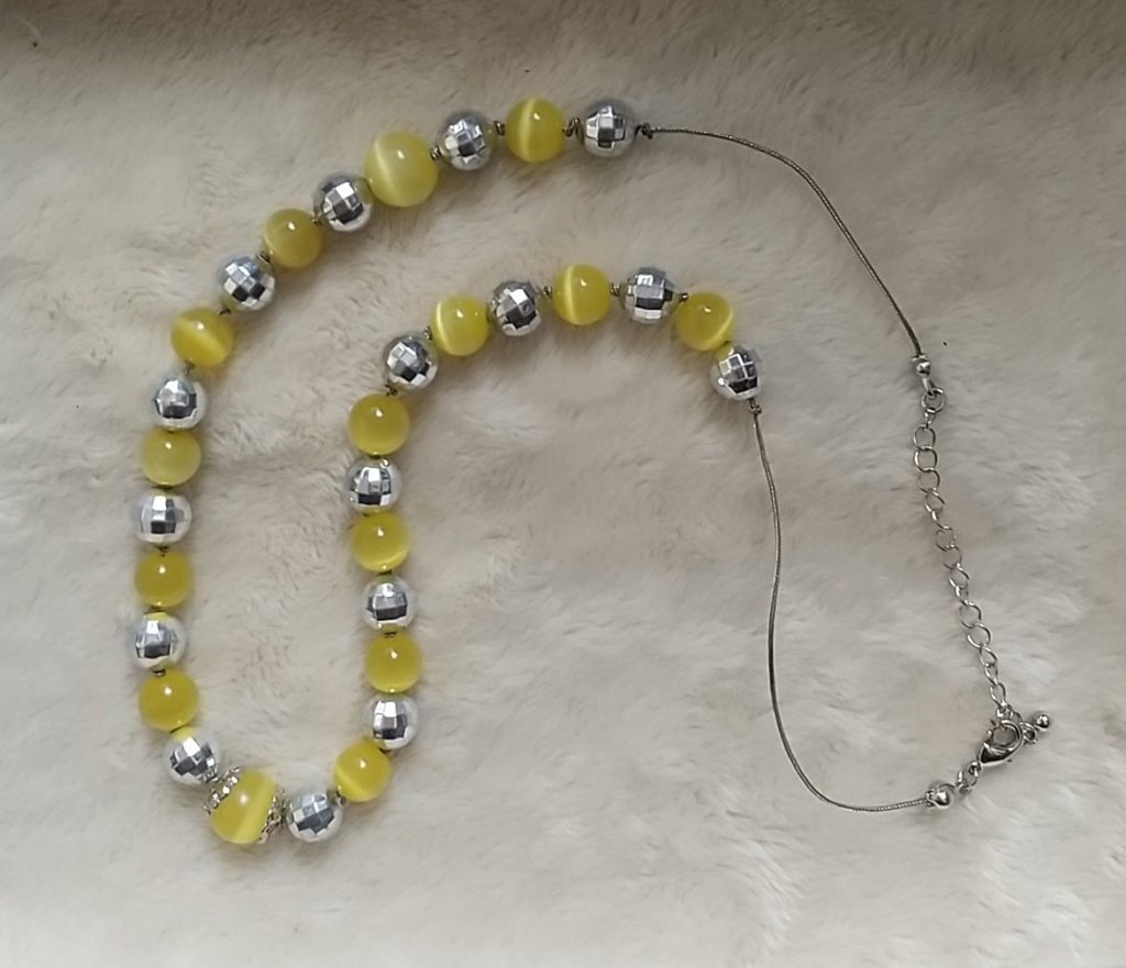 投稿日: 2020年11月15日2020年11月15日黄色のネックレス 胸元コーデ用にネックレスを制作 どうしても、服に合わせて黄色のネックレスが欲しかったので、家の在庫の人工石の黄色と、 おもちゃみたいな壊れた腕時計のバンドをバラして、 新しくネックレスを作りました☺ ちょっとポップな感じです。