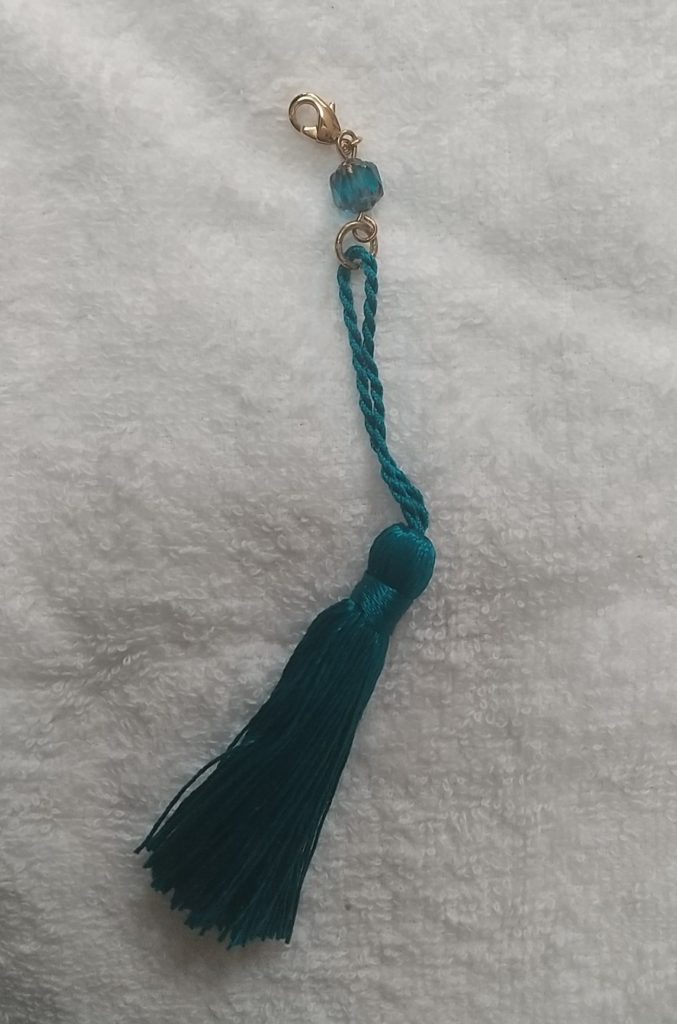 ターコイズブルーのタッセルを使ってマスクチャームを創りました。
