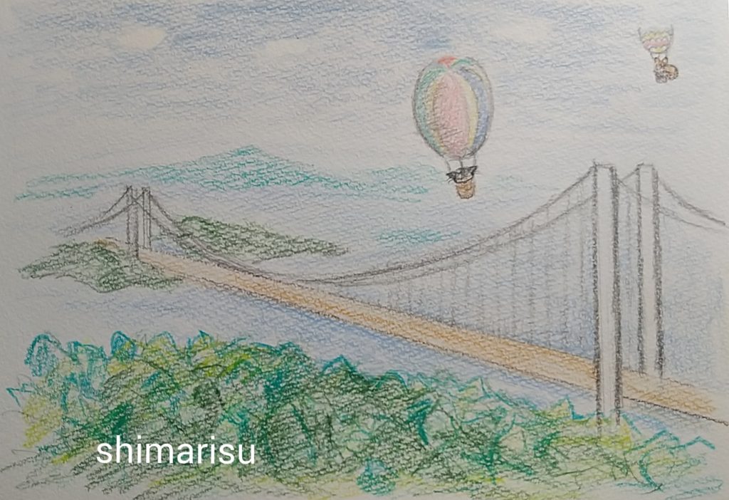 投稿日: 2021年6月20日2021年6月20日ミーコには、瀬戸大橋は空と海の境界線に見えた(色鉛筆画9) 長い長い橋に、ただただ見とれる 「瀬戸大橋を見に来たよ。 空から眺めると本当に長いね〜! 世界一長い道路鉄道併用橋なんだって。 ミーコは、前に瀬戸大橋の入口のところまで歩いたので、四国入りした気分になってたけど、瀬戸大橋はちゃんと香川県なんだって。 これができて、ようやく四国と本州が陸路で繋がったんだよ。便利になったよね。 人間は、大きな物を造るのが得意なんだね〜」