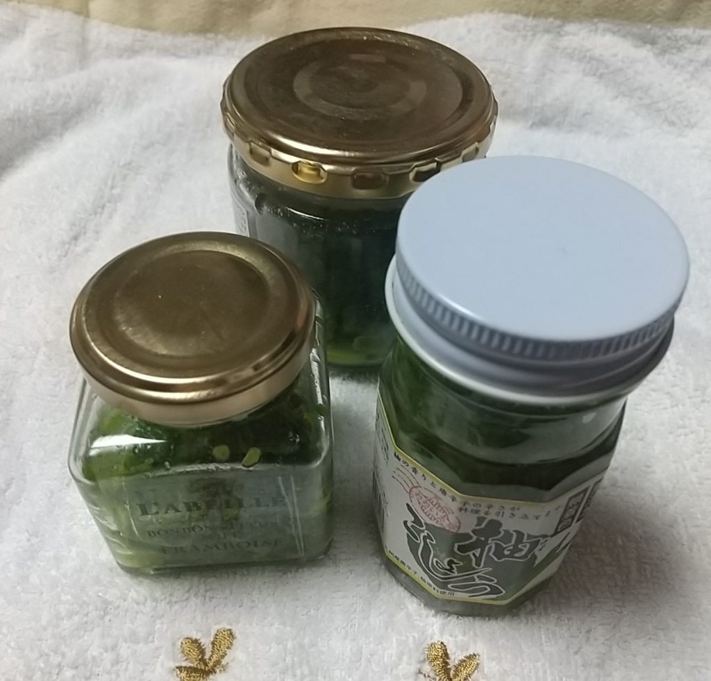 投稿日: 2020年10月3日2020年10月3日手作り柚子胡椒 無農薬の青い柚子 青唐辛子30本 出来た柚子胡椒 青柚子酒の仕込み 今年も、柚子胡椒作りやりました〜。 去年と一昨年の教訓を活かして、なるべく効率よくやったつもりだったけど、 柚子10個、青唐辛子30本とパウダー海塩で、量は去年の倍以上。 力尽きて、粗々微塵になってしまったので、出来た直後は痛いかも💦 余った柚子の実は酸っぱすぎて使いにくいので、青柚子酒として仕込みました。 今は、インスタントタピオカという、もらったお湯戻しタイプドリンクで休憩しています。 毎度の事ながら、力仕事だった〜💦